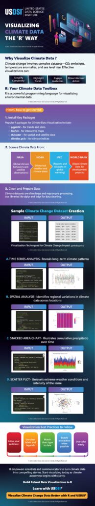 Climate-change datasets deserve more than just spreadsheets. The latest release from USDSI® – Visualizing Climate Data The ‘R’ Way reveals the power of data in telling Earth’s story. The infographic will walk you through a well-described toolkit to convert mountains of raw climate data into intuitive and actionable visuals.